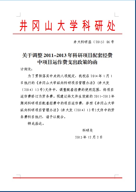 关于调整2011-2013年科研项目配套经费中项目运作费支出政策的函